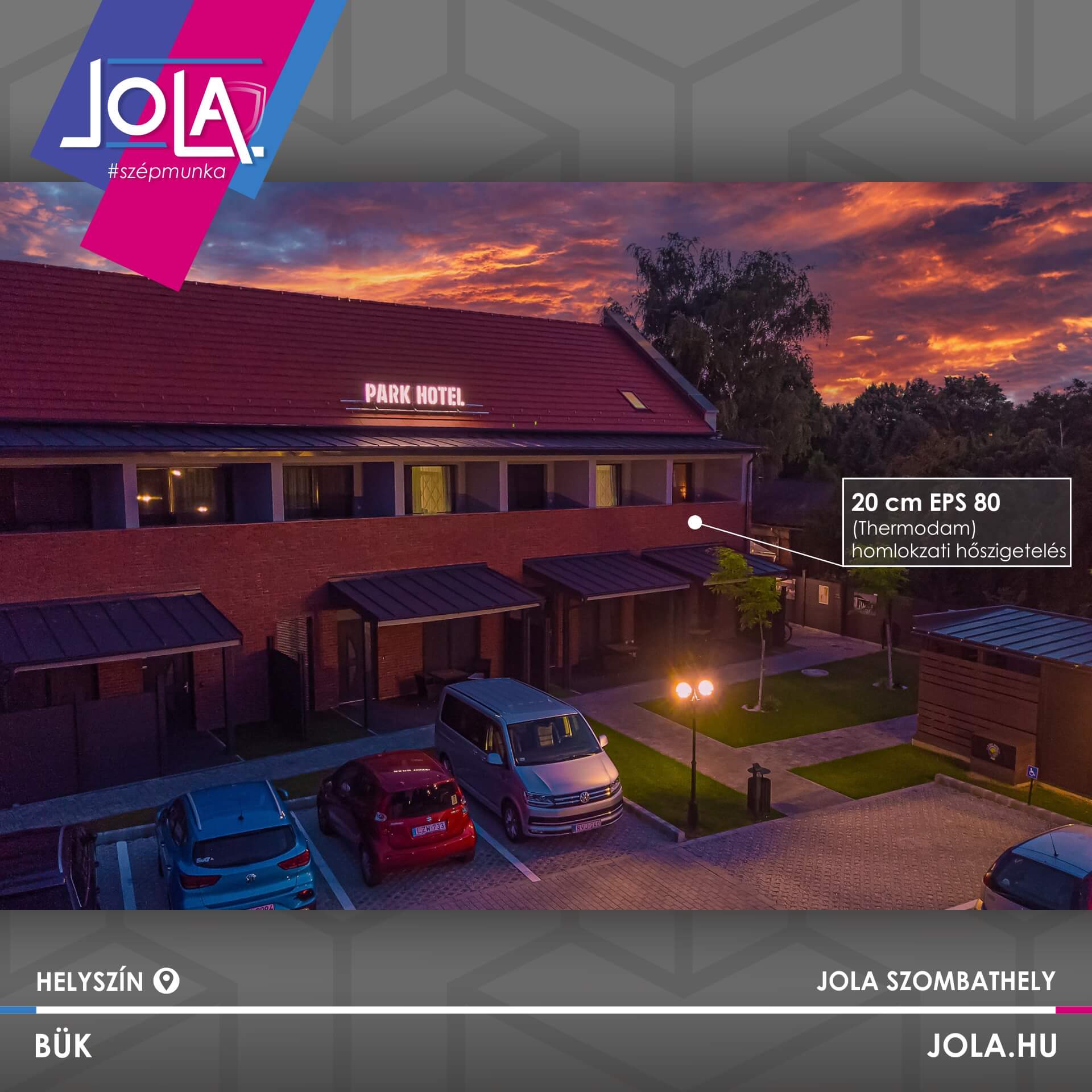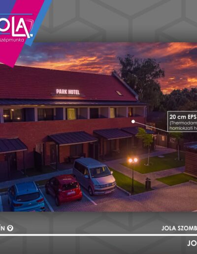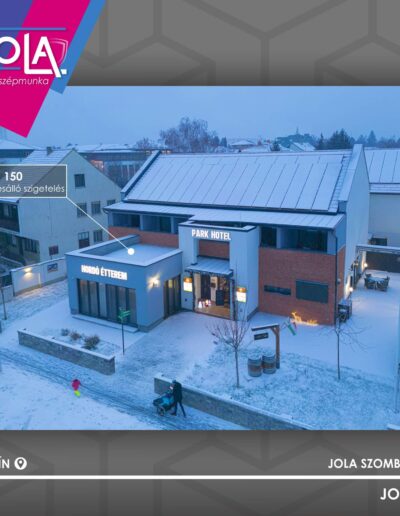 Az épület lábazatán és a falburkolattal burkolt homlokzati részeken 16cm-es Sopra XPS szigetelőanyagot használtunk . A falburkolatos részeken a nagy súly miatt dupla hálózással és dupla dűbelezéssel kiviteleztünk, az előírások szerint. A választott falburkolat a Pott Klinker kínálatából a rusztikus tégla lett