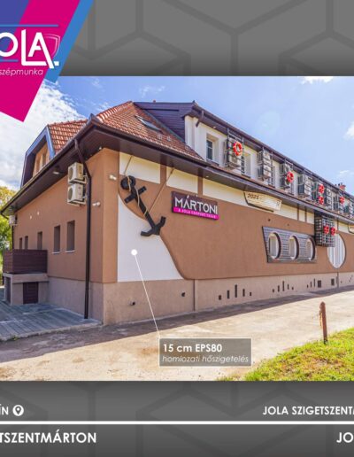 szálerősített polisztirolragasztót használatunk, az épület homlokzatának 2/3-ad részét polisztirollal (EPS 80, 15cm) 1/3-ad részt vakolható kőzetgyapottal (Petralana 15cm) burkoltunk.