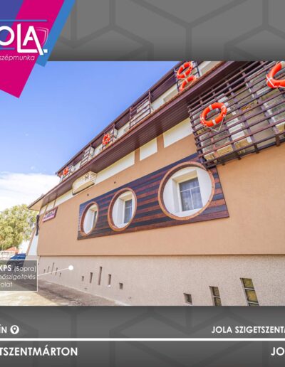 Lábazatot 12 cm-es XPS lábazati szigetelőlemezzel burkoltuk (Sopra). Lábazatra a saját JOLA vakolatot tettük, melyet a fürdőszobákban, beltérben is alkalmaztuk 100%-os víztaszító képessége miatt.